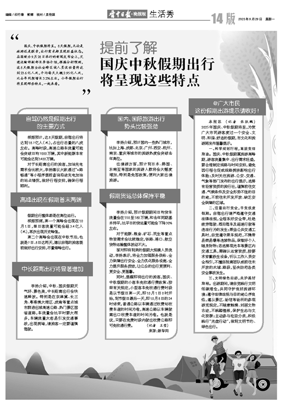 国庆、中秋假期将至。8天假期,无论是旅游还是探亲,出行需求都呈现旺盛状态。在国新办9月28日举行的新闻发布会上,交通运输部副部长李扬介绍,根据分析预测,这8天假期全社会跨区域人员流动量将达到23.6亿人次,平均每天大概2.95亿人次,比去年同期增长3.2%左右。今年假期出行将呈现哪些特点,一起来看。