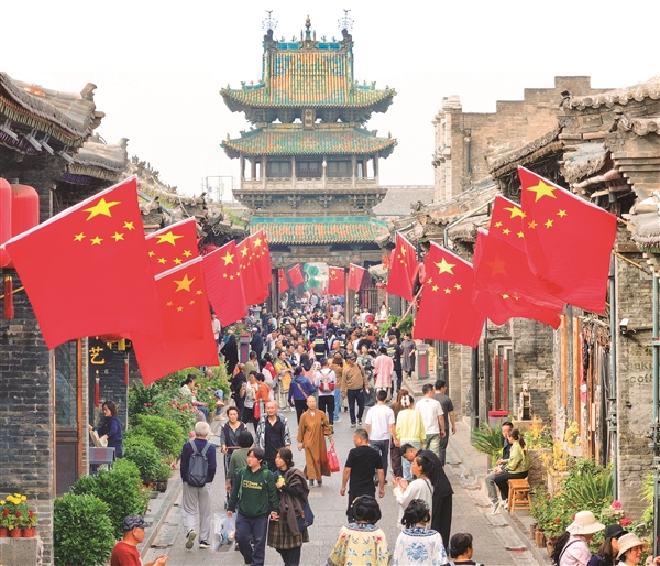9月28日,国庆中秋“双节”临近,平遥古城挂满了鲜艳的五星红旗,与古建筑交相辉映,营造出浓厚的节日氛围,点燃了游客与市民心中炽热的爱国情怀。通讯员 梁生仁 摄
