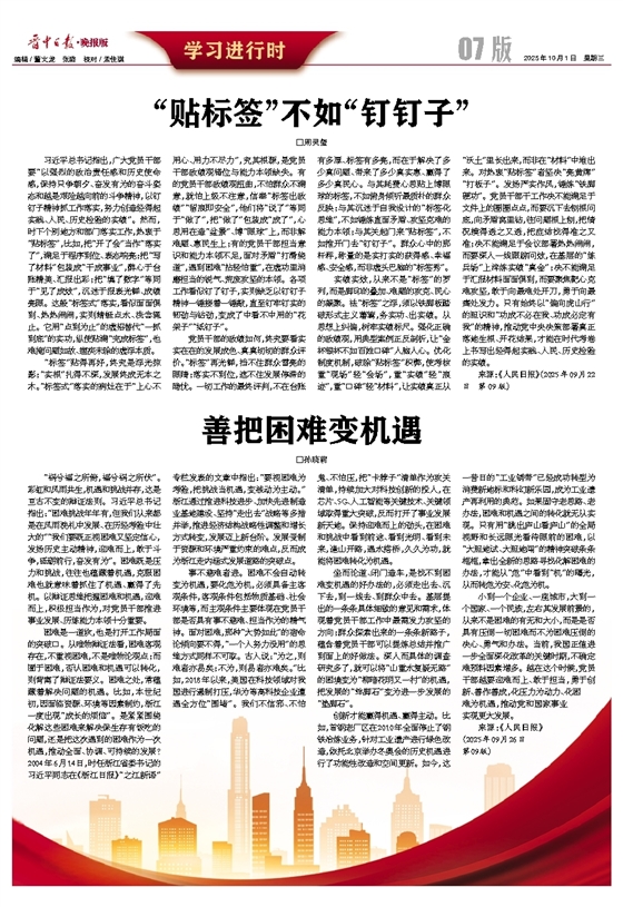 习近平总书记指出,广大党员干部要“以强烈的政治责任感和历史使命感,保持只争朝夕、奋发有为的奋斗姿态和越是艰险越向前的斗争精神,以钉钉子精神抓工作落实,努力创造经得起实践、人民、历史检验的实绩”。然而,时下个别地方和部门落实工作,热衷于“贴标签”,比如,把“开了会”当作“落实了”,满足于程序到位、表态响亮;把“写了材料”包装成“干成事业”,醉心于台账精美、汇报出彩;把“填了数字”等同于“见了成效”,沉迷于报表光鲜、成绩亮眼。这般“标签式”落实,看似面面俱到、热热闹闹,实则蜻蜓点水、浅尝辄止。它用“点到为止”的虚招替代“一抓到底”的实功,纵使贴满“完成标签”,也难掩问题如故、痼疾未除的虚浮本质。