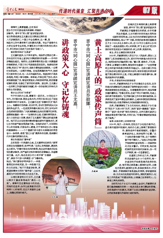 清漳河上晨雾氤氲,左权县石匣乡竹宁村村委会里传来清晰、明亮的讲解声。晋中市“同心圆”宣讲团宣讲员、省文物局选调生王尤嘉正在为聚拢过来的老人们讲解党的二十届三中全会精神,这一幕,是她驻村工作中最寻常不过的晨间风景。毕业于香港中文大学社会学专业的她,怀着投身乡村振兴的热忱扎根太行,早已把自己活成了左权县的“自家人”。