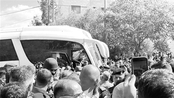 | 10月13日,在约旦河西岸城市拉姆安拉,国际红十字会的大巴载着巴勒斯坦获释人员抵达拉姆安拉文化馆(手机照片)。新华社记者 赵伟宏 摄 |