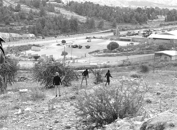 监狱外,以军车辆逡巡。这群激愤的少年用绳索和破布制成的投石器或徒手扔出石子,用尽全身力气,将愤恨掷向以军车辆。