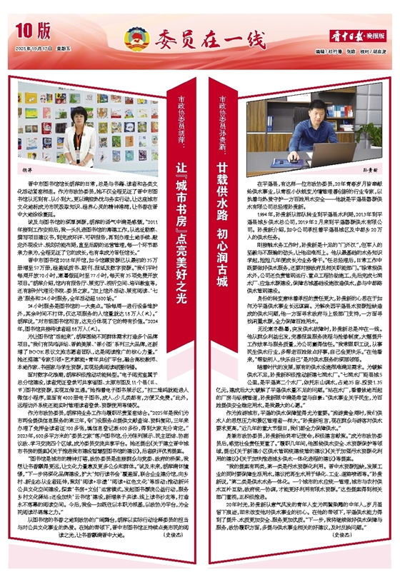 20年时光,孙贵新从意气风发的青年人变为两鬓染霜的中年人,岁月虽留下痕迹,却未改变他对供水事业的初心。在他的带领下,平遥供水能力得到了提升、水质更加安全、服务更加优质。“下一步,我将继续做好供水保障与服务,政协履职方面,多提与供水事业相关的好建议,及时反映问题。”