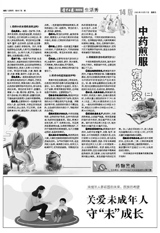 ⑤服药时间要合理:滋补类中药煎好后,应将头煎、二煎、三煎的煎液混合,晨起空服和晚上睡前服用较好。一般放置时间不宜超过12小时,以免药效成分损失。