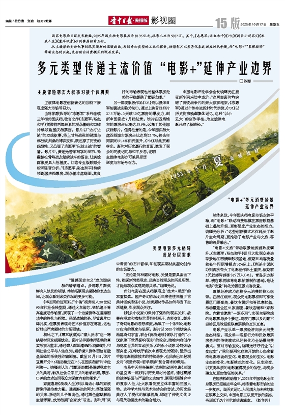 在国庆档的助推下,2025年中国电影全年总票房已超越去年全年,标志着电影市场的进一步复苏。当历史记忆、人间烟火与未来想象在银幕上交织,中国电影正以更开放的姿态,书写属于这个时代的光影篇章。(新华网)