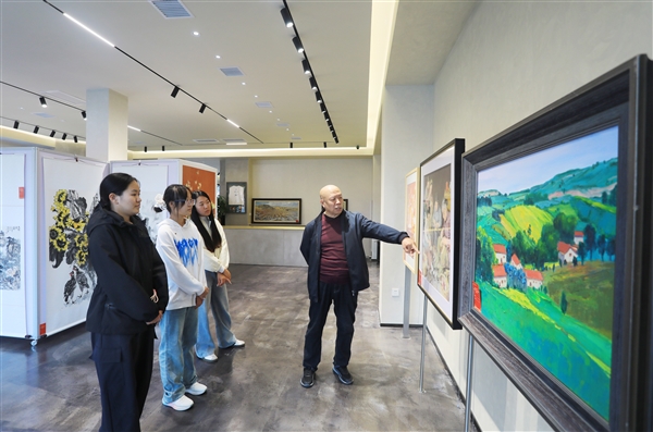 10月15日,晋中怡然青年广场M展厅内,市民欣赏“丹青传韵”美术作品展。本次展览由晋中市文联、晋中市美术家协会联合举办,艺术家们用独特的审美感受与艺术语言进行创作,以丹青描绘历史记忆、山河壮美、英雄形象和新时代和平画卷,以视觉艺术呈现中华儿女用鲜血铸就胜利的光辉历程,深情礼赞伟大抗战精神,热情讴歌祖国繁荣富强。记者 曹伟 摄