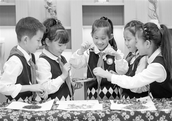 10月22日,在江苏省泰州市姜堰区实验小学教育集团北街北校区,学生体验称量中草药。