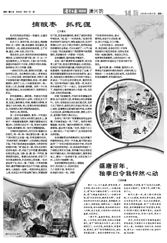 母亲问:“疼不疼?”我看着她留有血迹的嘴,不好意思地说一声,“不疼”。她用手背把嘴擦擦,告诉我,“摘的时候眼盯好,手要快,脚要稳,崖边枣不能摘。”后来,我就十分小心,偶尔被扎一下也不喊叫了,生怕母亲听到后来回跑。