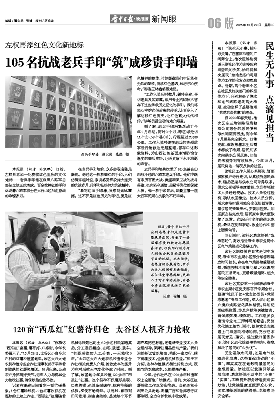记者在基地田间看到一派忙碌景象,1台红薯除秧机、1台红薯收获机在湿软的土地上作业,“西瓜红”红薯随着机械运转翻出泥土;10余名村民紧随其后,分工进行翻捡、去泥、装筐、装车。“机器采收加人工分拣,一天能收5亩。”太谷区大白大地农机种植专业合作社相关负责人介绍,抢收效率的提升为应对后续天气变化争取了时间。据了解,该基地今年共种植120余亩“西瓜红”红薯。这个品种不仅薯形美观、口感绵甜,还具备耐储存、抗病性强的优势,深受市场青睐。从选种、育苗到田间管理、病虫害防治,基地每个环节都严格把控标准,还邀请专业技术人员全程指导,保障红薯品质与产量。“我们用的是试管组培苗,搭配一垄双行、膜下滴灌技术,全流程机械作业。”郝子平介绍,这种种植模式相比传统方式,既能节约农资成本,又能提高产量。