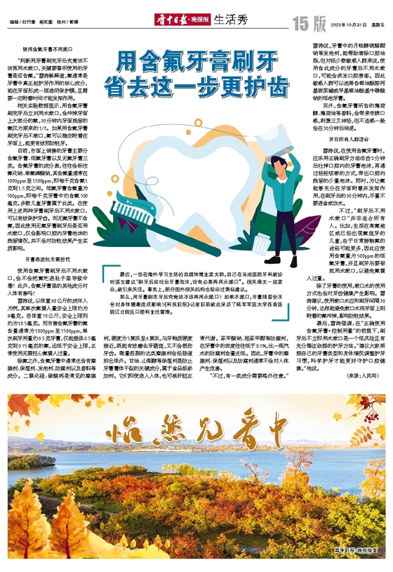 最后,雷涛强调,在“正确使用含氟牙膏+控制用量”的前提下,刷牙后不立即用水漱口是一个低风险且有充分循证依据的护牙方法。“建议大家根据自己的牙膏类型和身体情况调整护牙习惯,科学护牙才能更好守护口腔健康。”他说。