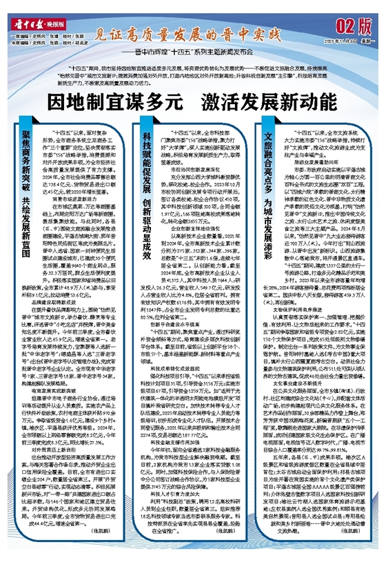 “十四五”期间,我市坚持因地制宜推进适度多元发展,将资源优势转化为发展优势——不断促进文旅融合发展,持续擦亮“怡然见晋中”城市文旅新IP;提振消费加强对外开放,打造内陆地区对外开放新高地;升级科技创新发展“主引擎”,积极培育发展新质生产力,不断激发高质量发展动力活力。