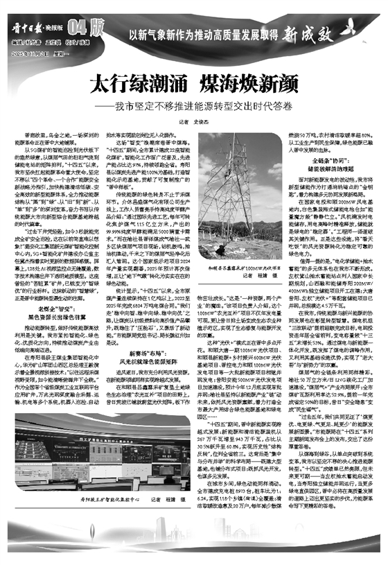 从5G煤矿的智能巡检到光伏板下的盎然绿意,从煤层气田的汩汩气流到储能电站的矩阵排列,“十四五”以来,我市坚决扛起能源革命重大使命,坚定不移以“四个革命、一个合作”能源安全新战略为指引,加快构建清洁低碳、安全高效的新型能源体系,全力推动能源结构从“黑”到“绿”、从“旧”到“新”、从“单”到“多”的深刻变革,奋力书写从传统能源大市向新型综合能源基地跨越的时代篇章。