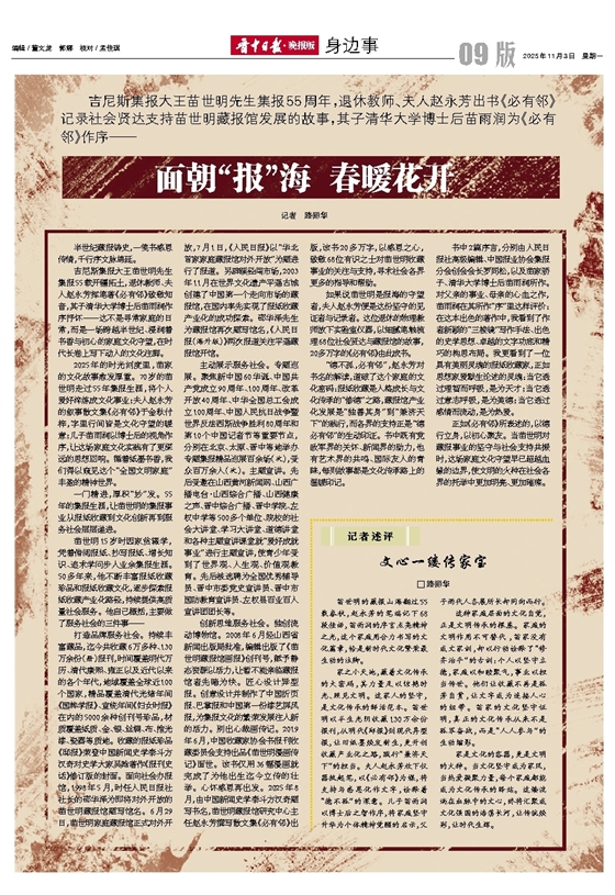 吉尼斯集报大王苗世明先生集报55载开疆拓土,退休教师、夫人赵永芳挥笔著《必有邻》致敬知音,其子清华大学博士后苗雨润作序抒怀——这不是寻常家庭的日常,而是一场跨越半世纪、浸润着书香与初心的家庭文化守望,在时代长卷上写下动人的文化注脚。