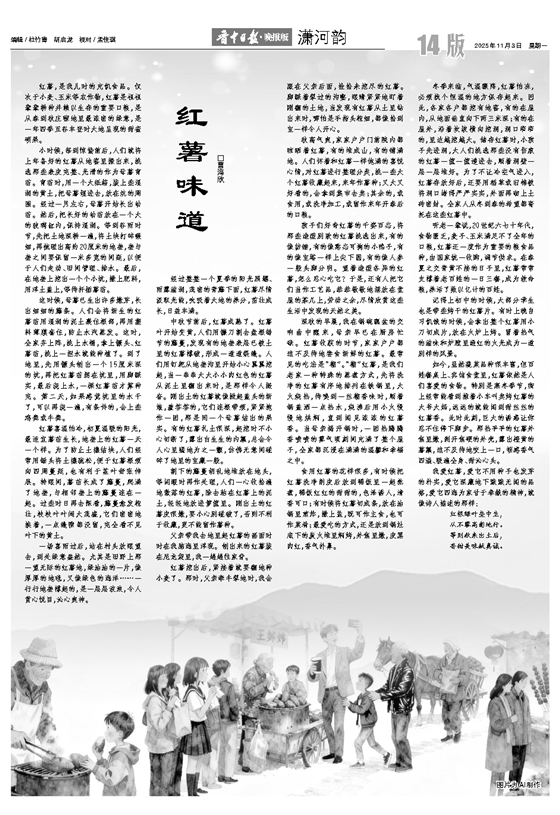 如今,虽然蔬菜品种很丰富,但百姓餐桌上、宾馆食堂里,红薯依然是人们喜爱的食物。特别是寒冬季节,街上经常能看到推着小车叫卖烤红薯的大爷大妈,远远的就能闻到甜丝丝的红薯香。此时此刻,巨大的诱惑让你忍不住停下脚步。那热乎乎的红薯外焦里嫩,剥开焦硬的外壳,露出橙黄的薯瓤,迫不及待地咬上一口,顿感香气四溢、暖遍全身、甜沁心头。