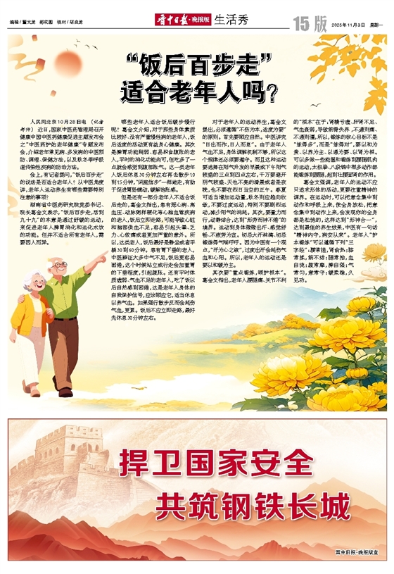 湖南省中医药研究院党委书记、院长葛金文表示,“饭后百步走,活到九十九”的本意是通过舒缓的运动,来促进老年人脾胃消化和运化水饮的功能。但并不适合所有老年人,需要因人而异。