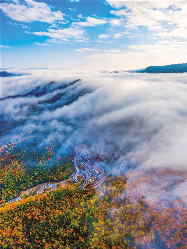 深秋时节,左权县太行龙泉风景区五彩缤纷,太行一号旅游公路似一条长龙盘旋而上,冲入峰回路转的峰巅云瀑之中,蔚为壮观。