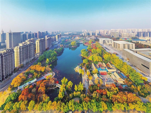 初冬时节,俯瞰市城区晋商公园,依然五彩斑斓,金色绚烂,宛若仙境,如诗似画,展现出人与自然和谐共生的城市“绿肺”生态画卷。晋中,这座城市“颜值”越来越高,增强了群众的获得感和幸福感。通讯员 邢兰富 摄