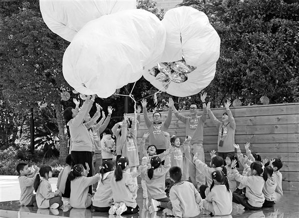 11月15日,在上海浦东美术馆领地花园举行的“敢作气候担当,点亮儿童未来”创意点亮活动中,孩子们与设计师团队共同打造并升起“气候云”悬浮云朵艺术装置。