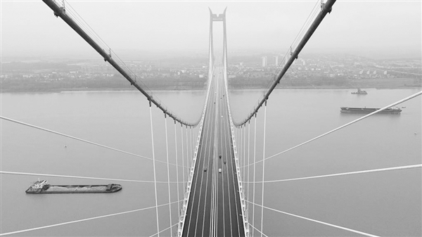 该桥是我国首座双层斜拉—悬索协作体系大桥,路线全长11.9公里,具有高速公路、城际铁路、货运铁路三种过江功能。新华社 张端 摄