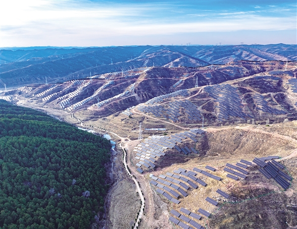 11月22日,左权县高马沟,冬日的太行山层峦静美,连绵光伏板与山脊相映成景。昔日荒山坡,如今因光伏电站重焕生机。