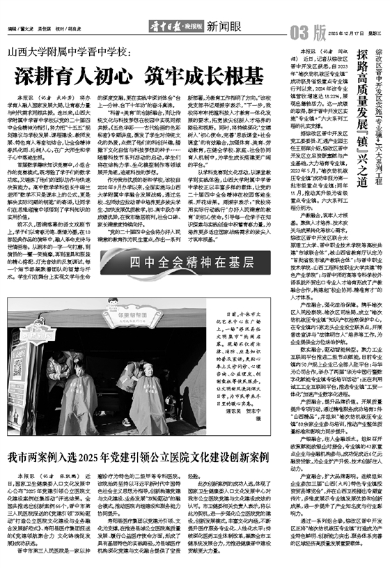 本报讯 (记者 张凯鹏) 近日,国家卫生健康委人口文化发展中心公布“2025年党建引领公立医院文化建设案例征集活动”评选结果。全国共推选出创新案例66个,晋中市第三人民医院报送的《党建引领“双轮驱动”打造公立医院文化建设与业务融合发展新范式》、寿阳县医疗集团报送的《党建领航聚合力 文化铸魂促发展》成功获选。