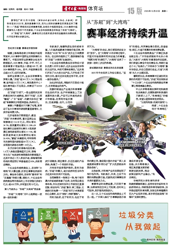 新华社广州12月19日电 (新华社记者王浩明、王恒志、王春燕) 即将收官的2025年,是体育赛事大年,而与之相伴的赛事经济更是迎来了爆发——“苏超”带领民间足球赛事热潮,各地你方唱罢我登场;2025赛季中超联赛观众人数创下历史新高,十五运会和残特奥会则制造了顶流“大湾鸡”。
