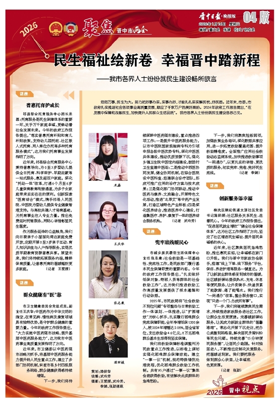 榆次区锦纶街道文源社区党委书记温丽媛:社区服务关系民生、连着民心。今年的政府工作报告提出,“促进居民就业增收”“健全社会保障体系”,这为社区工作指明了方向,坚定了社区增进民生福祉、提升居民幸福感的决心。
