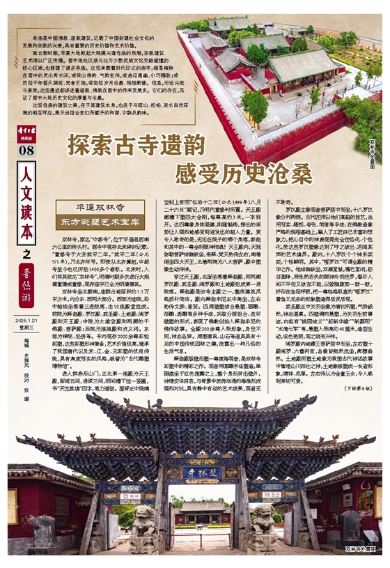 南北朝时期,华夏大地掀起大规模兴建寺庙的热潮,宗教建筑艺术得以广泛传播。晋中地处汉族与北方少数民族文化交融碰撞的核心区域,也修建了诸多寺庙。这些承载着时代印记的庙宇,错落掩映在晋中的灵山秀水间,或依山傍势、气势宏伟,或曲径通幽、小巧精致;或历经千年香火绵延、梵音不绝,或饱经岁月沧桑、残垣断壁。但是,无论兴旺与衰败,这些遗迹都讲述着道教、佛教在晋中的传承发展史。它们的存在,见证了晋中大地历史文化的厚重与沧桑。