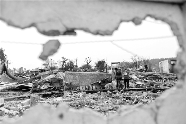 1月19日,当地居民在智利比奥比奥大区彭科市的火灾受灾区域进行清理。