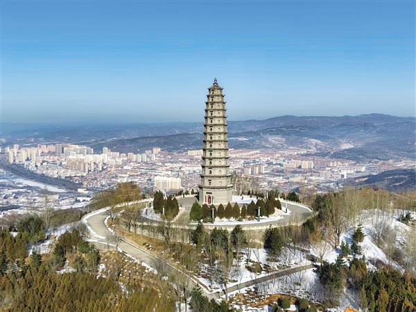冬日的左权县鳌峰公园在蓝天、白雪、群山、梯田,以及苍松翠柏的映衬下,尽显大自然之美和厚重文化之韵。