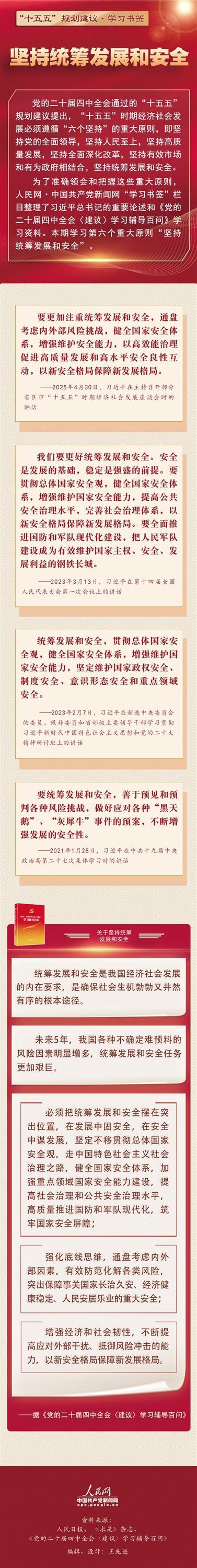 为了准确领会和把握这些重大原则,人民网·中国共产党新闻网“学习书签”栏目整理了习近平总书记的重要论述和《党的二十届四中全会<建议>学习辅导百问》学习资料。本期学习第六个重大原则“坚持统筹发展和安全”。