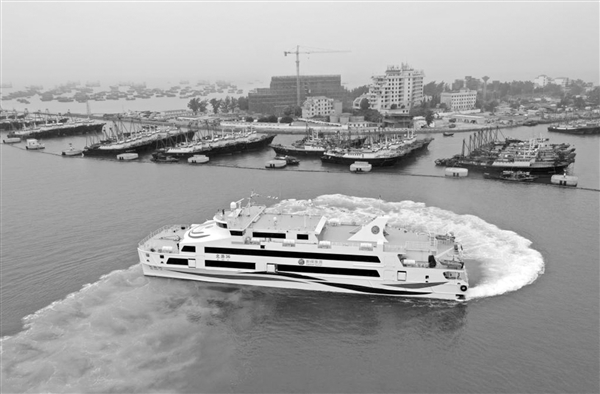据介绍,“北游36”轮是广西最新投入的一艘1200客位的高速客船,由国内专业院所和船厂合力打造,采用了全铝合金双体结构与四机四喷泵先进推进系统,总长71米,设计航速29节,实测最大航速超过32节。