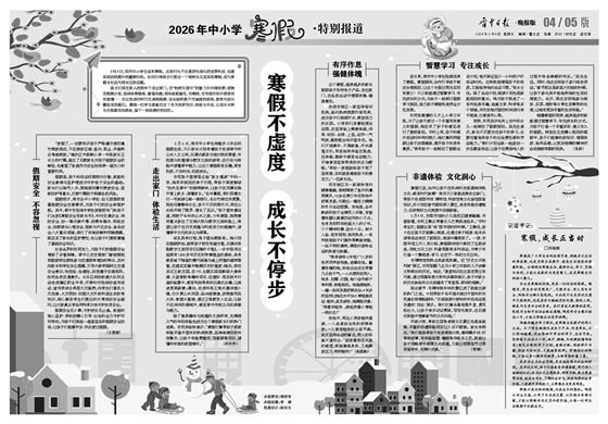 2月6日,我市中小学生迎来寒假。这段时光不仅是放松身心的宝贵机会,也是实现自我提升的重要阶段。如何引导孩子们度过一个既快乐又充实的寒假,成为家庭与社会共同关注的话题。