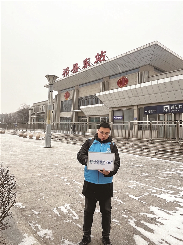 2月4日,祁县高铁站广场人潮涌动,返乡旅客一边拖着行囊高高兴兴奔赴归乡路,一边与家人视频报平安、查询返乡路线。曹阳手持笔记本电脑在广场专注监测着现场5G网络的速率与信号稳定性,细致记录每一组数据。