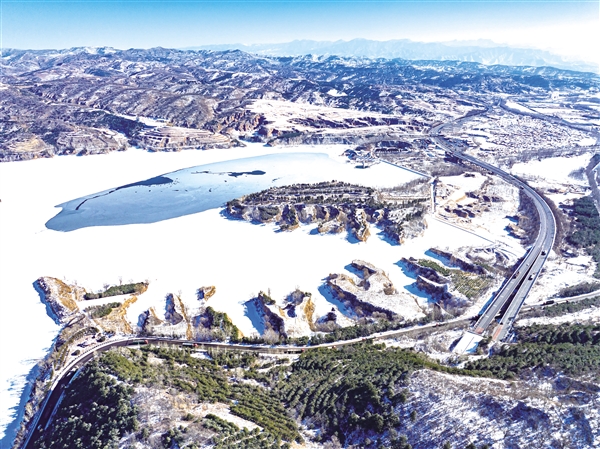 2月7日,雪后初晴,左权县清漳河国家湿地公园的石匣库区静卧于初春阳光下。春雪皑皑,天地澄明,一派静谧诗韵。东吕高速与国道东子线如丝带般蜿蜒穿行山水之间,为这幅自然画卷注入了生动的时代脉搏。