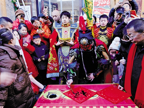 2月8日,农历腊月二十一,太谷古城南街热闹非凡,关公巡城民俗展演精彩上演,为年货节、社火节预热助兴。当天,央视《星光大道》走出的邢震身着戏服、手持青龙偃月刀,扮相英武、气韵传神,沿古城巡城、赐福,尽显关公忠义勇武之姿。作为陆树铭亲传弟子、世界关公协会会员,邢震以赤子之心助力家乡文化宣传。