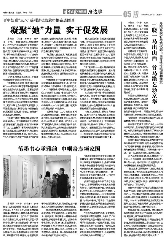 “巾帼榜样·时代先锋”优秀典型事迹主题宣传奏响奋进强音。《山西妇女报》《晋中日报》《晋中日报·晚报版》及“1+11”妇联媒体矩阵同步发力,全方位、多角度讲述全国、省级先进个人与集体在政策宣讲、经济发展、乡村振兴、科技创新等领域的奋斗故事,让忠诚坚守的初心、担当奉献的精神、追求卓越的品格深入人心,以榜样力量引领更多妇女勇立潮头、争当先锋。
