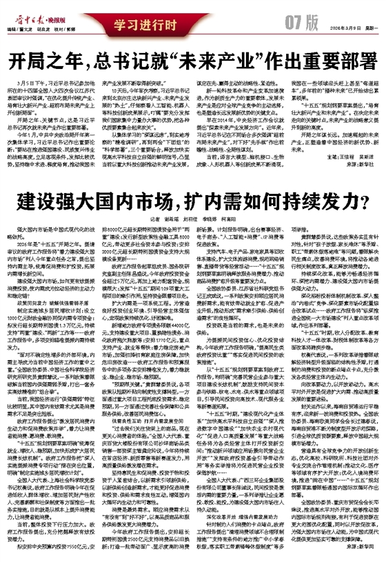2026年是“十五五”开局之年。提请审议的政府工作报告将“着力建设强大国内市场”列入今年重点任务之首,提出坚持内需主导,统筹促消费和扩投资,拓展内需增长新空间。