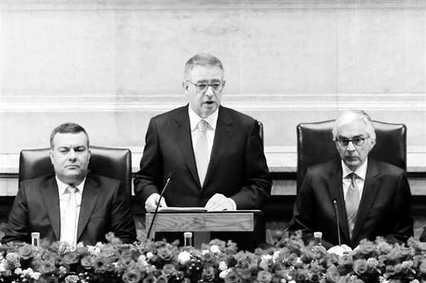 | 3月9日,在葡萄牙里斯本,葡萄牙新总统安东尼奥·若泽·塞古罗(中)发表就职演说。 新华社记者 荀伟 摄 |