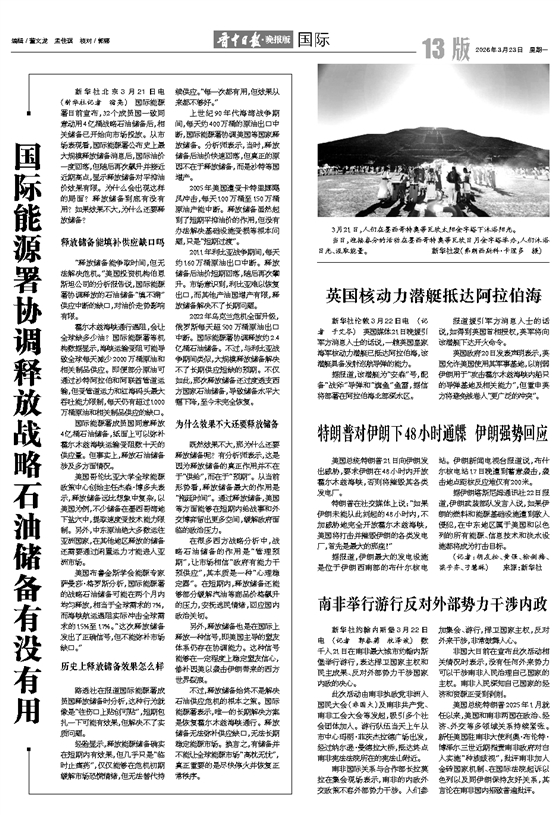 新华社北京3月21日电 (新华社记者 宿亮) 国际能源署日前宣布,32个成员国一致同意动用4亿桶战略石油储备后,相关储备已开始向市场投放。从市场表现看,国际能源署公布史上最大规模释放储备消息后,国际油价一度回落,但随后再次飙升并接近近期高点,显示释放储备对平抑油价效果有限。为什么会出现这样的局面?释放储备到底有没有用?如果效果不大,为什么还要释放储备?