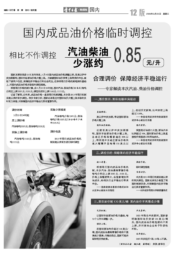 记者了解到,近年来,成品油价格一直按现行机制调整,本次是2013年现行机制实施以来的首次调控。相关专家分析,国家此举是应对国际油价大幅上涨采取的及时有力举措,对保障国内经济平稳运行具有重要作用。