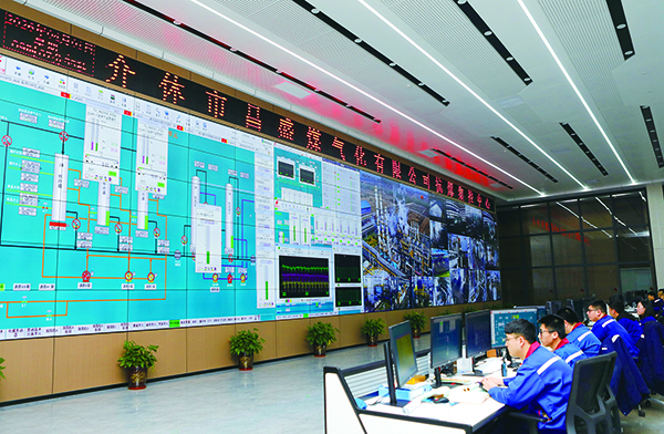 步入企业抗爆集控中心,科技感扑面而来。巨型电子显示屏上,甲醇生产线各项生产数据实时跳动、动态更新。30余名技术人员坐在控制台前,轻点鼠标便可实现全流程生产远程操控。李贺军介绍:“企业依托5G+工业互联网核心技术,打造了智能配煤、无人化焦炉五大车、全流程数字孪生三大智能系统,用数字化智控为传统产业装上‘智慧大脑’。”