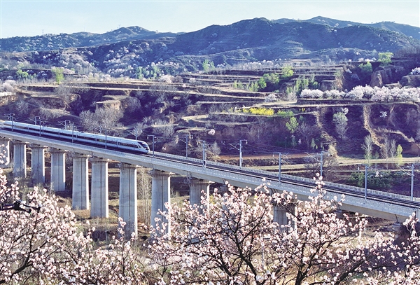 4月7日,榆社县云竹湖畔春意正浓,一列高铁宛若银龙,穿行在漫山杏花簇拥的高架桥上。如雪似玉的花海、新柳初绽的嫩绿,与飞驰而过的列车相映成趣,绘就一幅灵动鲜活的春日画卷。现代交通的迅捷与乡野春光的温婉相映生辉,彰显出乡村振兴与时代发展同频共振的勃勃生机。通讯员 张卫兵 摄
