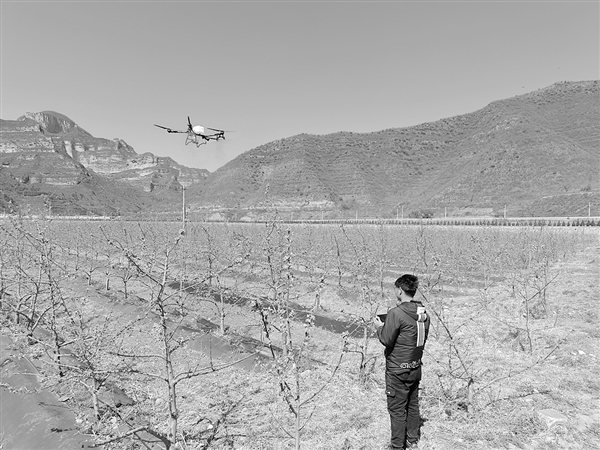 4月6日,左权县和平果业农民专业合作社的技术人员操控无人机,开展春季果树管理作业。当下正值果树开花季,该合作社抢抓时令,对5个种植基地的200余亩苹果树、樱桃树、梨树开展防病虫害、施营养肥喷洒作业,为今年果品丰产、农民增收筑牢基础。通讯员 刘永红 摄