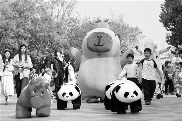 ②4月4日,游客在湖北省襄阳市华侨城奇幻谷景区观看神奇动物大迁徙巡游表演。新华社 杨东 摄
