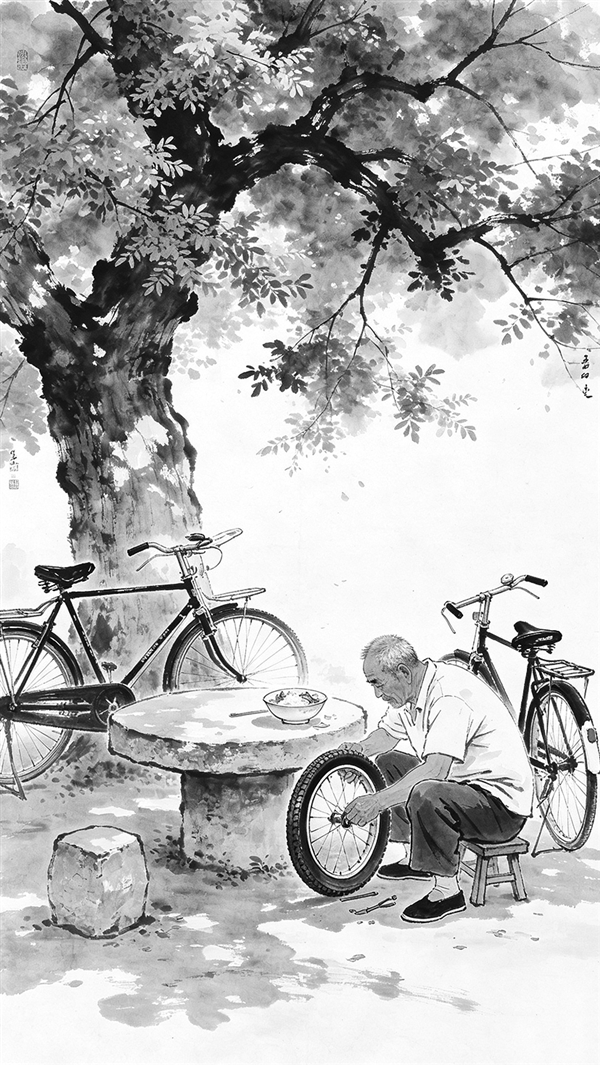 村里人有事,爱找三伯帮忙,凡是张口的人,就没有被拒绝的,而且帮忙从不要别人一分钱。夏日中午,太阳火辣辣的,邻居们在门前大槐树下的石桌旁,边吃饭边唠家常,热热闹闹的。有跑校放学的孩子,还没顾上回家就推着自行车急急忙忙来找三伯:“三伯,车胎破了,你给补一补,我今下午上学还得用。”遇到这种情况,三伯总是放下碗就开始修自行车。有时院里能放四五辆自行车,看着就像个自行车修理摊。他修理自行车的工具一应俱全,常年帮大伙修车,习惯性的,大家把他当成了村里免费的自行车维修师傅。有时修车的孩子们接二连三来,三伯的饭时一推再推,而他任劳任怨,总是乐呵呵地对待,仔细地检查、修理,认为没问题才罢手。因此,他倍受孩子们爱戴。我曾打趣说:“三伯,这么多人找你修理自行车,要不适当收些材料费?”他难得严肃地说:“都是一个村的乡亲,可不敢说收钱,要不伤情面了,打帮打帮是应该的。”看着三伯板起面孔却说着朴实、暖心的话,我笑出了声。