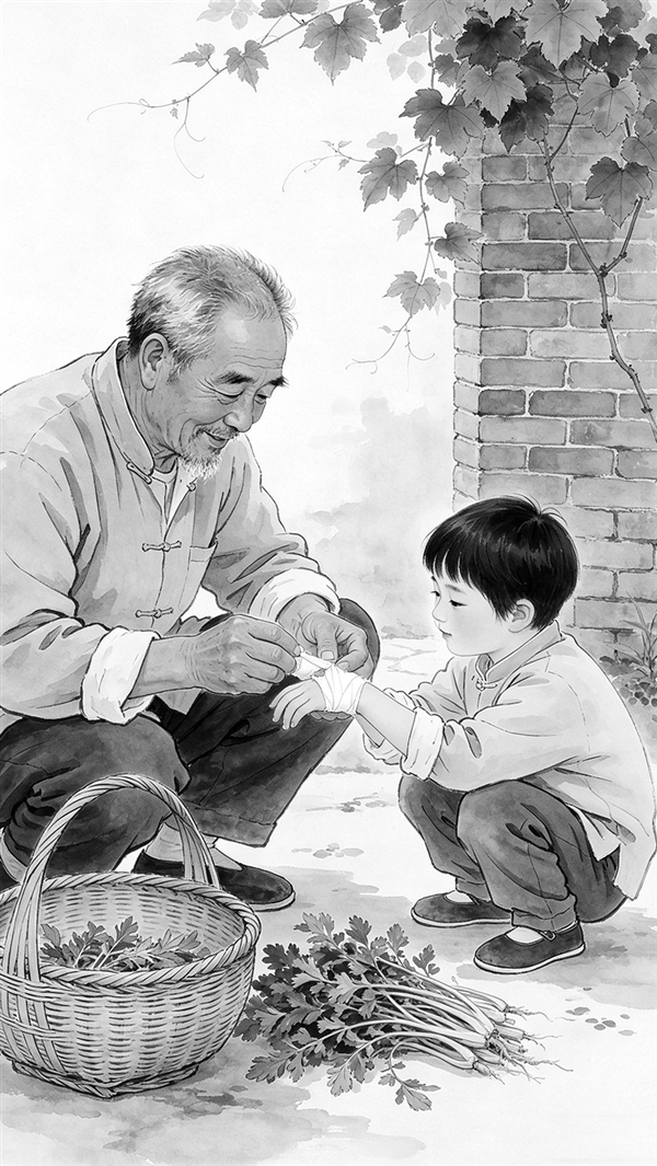 那年夏天,婆婆要回娘家,公公正逢轮值给村里放牛,婆婆临出门叮嘱我只管看好孩子,等孩子爷爷放牛回来做饭。看着日头越来越高,太阳晒得火辣辣的,我想这大热天放牛很辛苦,不如自己动手做饭,让孩子爷爷回来就能吃便饭,还能多休息一会儿。我把案板放院里枣树下的石桌上,把孩子放我两腿之间的凳子上坐稳,坐下来开始切菜,切了两下看见血一下子冒出来了,吓得我赶紧撂下刀,紧张地看我的手伤得怎么样,结果是完好无损。一低头,小宝贝脸憋得发青,正哭得喘不上气来,娇嫩的手指在流血,可能是她太疼了,所以好半天才哭出声。等孩子“哇”的一声哭出来,我抱起她就往三伯家飞奔。三伯正在院里做饭,看到孩子流血不止的手,赶紧拿药止血包扎。经过这一惊吓,我沮丧地低着头生闷气,听见三伯说:“你看好孩子,我去你家做饭。”我难以置信地抬头看着他,心中充满感激。至今我还记得那顿连汤面,香喷喷的,本来抑郁的心情被这简单可口的饭治愈了。而他的这份恩情,我也默默铭记在心。